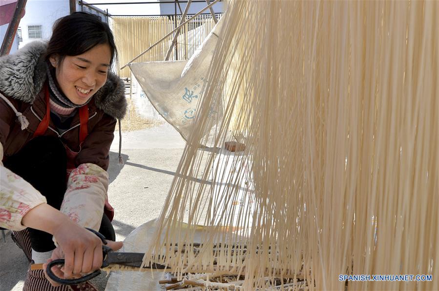 SHAANXI, febrero 1, 2018 (Xinhua) -- Imagen del 31 de enero de 2018 de la residente Li Qun elaborando fideos secos, en la villa de Wulangmiao del condado de Yangxian, provincia de Shaanxi, en el noroeste de China. Cerca de 80 hogares de la villa se benefician de sus fideos secos tradicionales hechos a mano. (Xinhua/Luo Hantao)