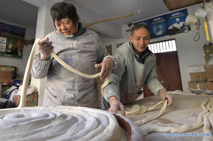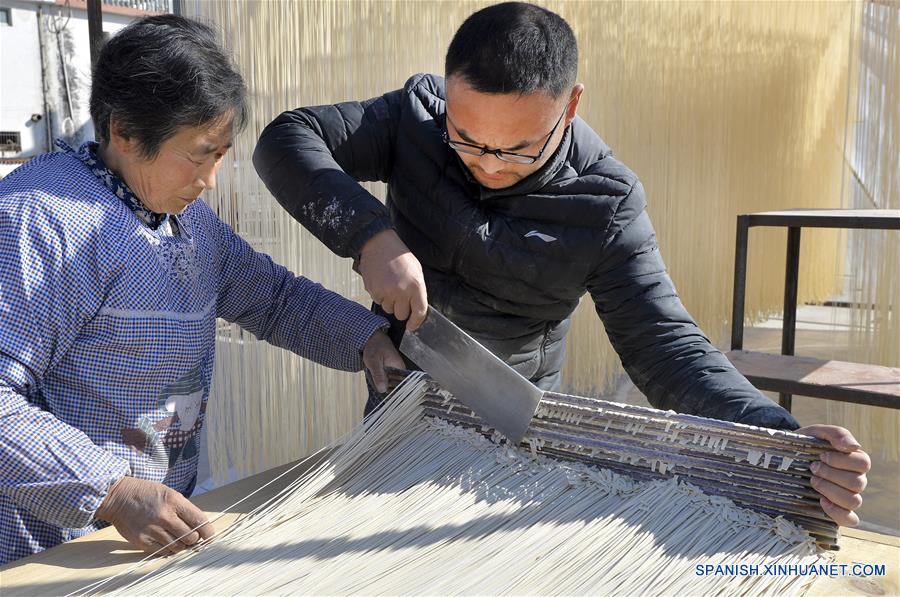 SHAANXI, febrero 1, 2018 (Xinhua) -- Imagen del 31 de enero de 2018 del residente Yan Chongwen (d) y su esposa elaborando fideos secos, en la villa de Wulangmiao del condado de Yangxian, provincia de Shaanxi, en el noroeste de China. Cerca de 80 hogares de la villa se benefician de sus fideos secos tradicionales hechos a mano. (Xinhua/Luo Hantao)