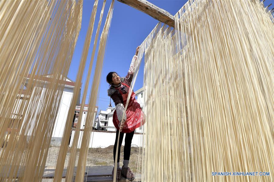 SHAANXI, febrero 1, 2018 (Xinhua) -- Imagen del 31 de enero de 2018 de la residente Li Qun colgando fideos secos, en la villa de Wulangmiao del condado de Yangxian, provincia de Shaanxi, en el noroeste de China. Cerca de 80 hogares de la villa se benefician de sus fideos secos tradicionales hechos a mano. (Xinhua/Luo Hantao)
