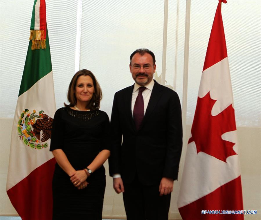 CIUDAD DE MEXICO, febrero 1, 2018 (Xinhua) -- El secretario de Relaciones Exteriores de México, Luis Videgaray (d), y su homóloga canadiense Chrystia Freeland (i), posan durante su reunión en la Ciudad de México, capital de México, el 1 de febrero de 2018. Los gobiernos de Canadá y México acordaron el jueves seguir trabajando por el desarrollo regional e impulsar los mecanismos de cooperación bilateral en materia de formación de capital humano, comercio y movilidad de personas, informó la cancillería mexicana. Este compromiso se logró durante una reunión entre el titular de la Secretaría de Relaciones Exteriores (SRE) de México, Luis Videgaray, y su homóloga canadiense Chrystia Freeland. (Xinhua/Str)