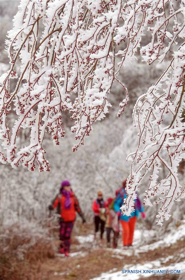 Turistas observan el paisaje escarchado en la monta?a Yunwu en Guiyang, capital de la provincia de Guizhou, en el suroeste de China, el 3 de febrero de 2018. (Xinhua/Qiao Qiming)