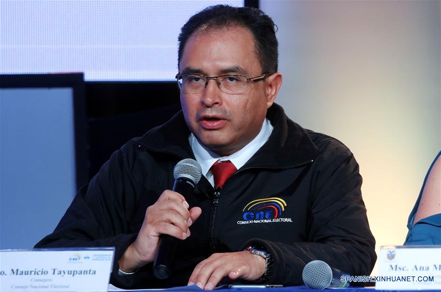 QUITO, febrero 4, 2018 (Xinhua) -- El Consejero Nacional Electoral, Mauricio Tayupanta, pronuncia un discurso durante una ceremonia para llamar a votar a más de 13 millones de ecuatorianos en Quito, Ecuador, el 4 de febrero de 2018. Durante la jornada electoral de consulta popular y referendo del domingo en Ecuador fueron detenidas 302 personas, informó el Consejo Nacional Electoral (CNE) del país sudamericano. La presidenta del CNE, Nubia Villacís, detalló en conferencia de prensa que del total de personas detenidas, 144 fueron por boletas de apremio o prisión por no pago de pensiones alimenticias, mientras que 158 por otro tipo de delito. (Xinhua/Micaela Ayala V./ANDES