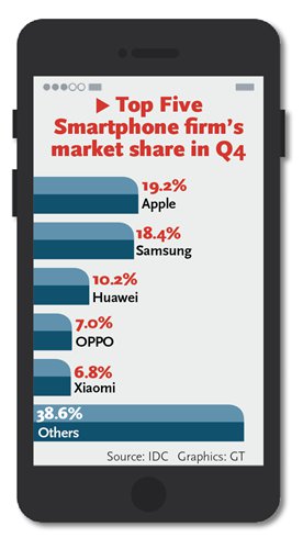 Beijing, 05/02/2018(El Pueblo en Línea) – Los fabricantes chinos de teléfonos inteligentes cerraron el a?o 2017 con una buena nota, capturando tres de los primeros lugares en la lista de las cinco principales empresas de teléfonos inteligentes de International Data Corp (IDC), y superando sustancialmente a las empresas globales dominantes en el crecimiento de envíos.
