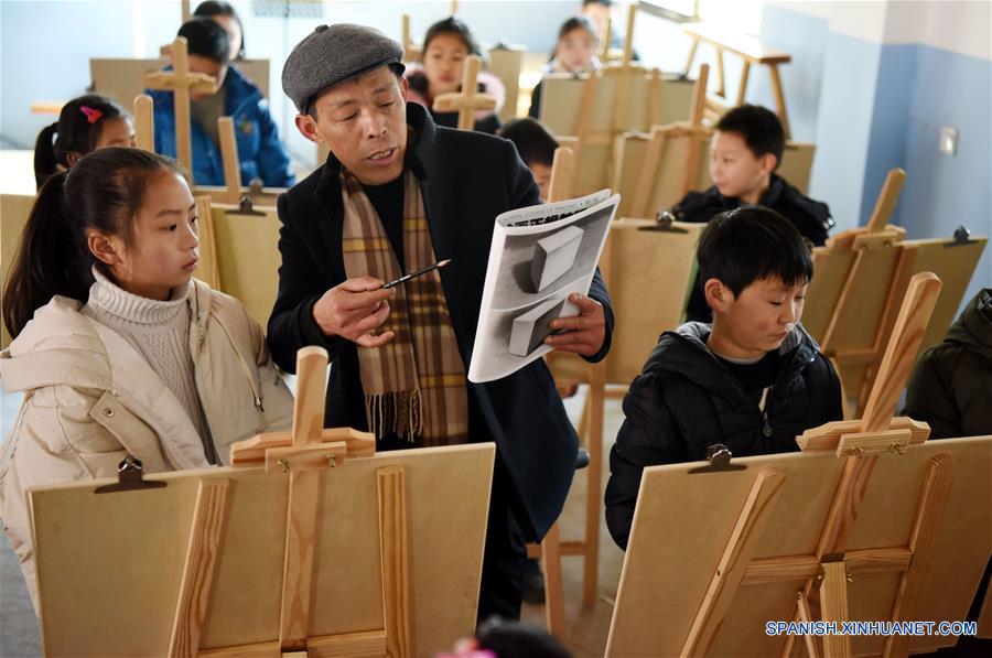 JIANGXI, febrero 5, 2018 (Xinhua) -- Ding Yifei (i-frente), ense?a a una ni?a, en una escuela de caridad en la villa de Hangshan, en el municipio de Taihe, en el condado de Nanfeng, provincia de Jianxi, en el este de China, el 5 de febrero de 2018. La villa de Hangshan se localiza en una área remota de la región. Como muchos padres dejan su hogar para ir a trabajar, muchos ni?os se tienen que quedar en sus casas. Xi Weixing, un aldeano local comenzó a trabajar en la provincia de Guangdong, construyó una escuela de caridad que ofrece cursos gratuitos después de la escuela y almuerzo para los ni?os que se quedan, cuyos padres generalmente laboran como trabajadores migratorios en otras ciudades. La escuela está abierta a los ni?os, los días festivos y fines de semana. (Xinhua/Song Zhenping)