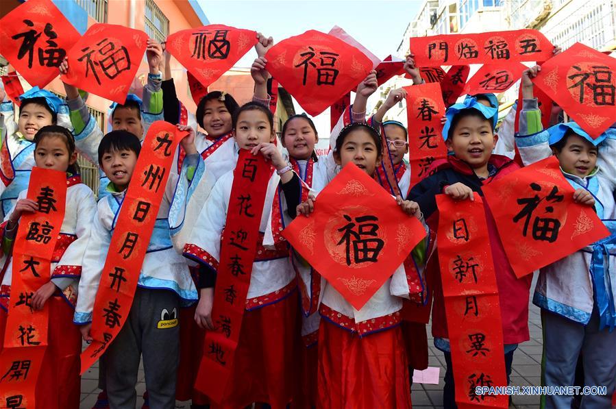 Estudiantes del grupo de hobby de caligrafía china, muestran coplas Del Festival de Primavera escritas por ellos, en la comunidad de Cangzhou, provincia de Hebei, en el norte de China, el 5 de febrero de 2018. (Xinhua/Fu Xinchun)