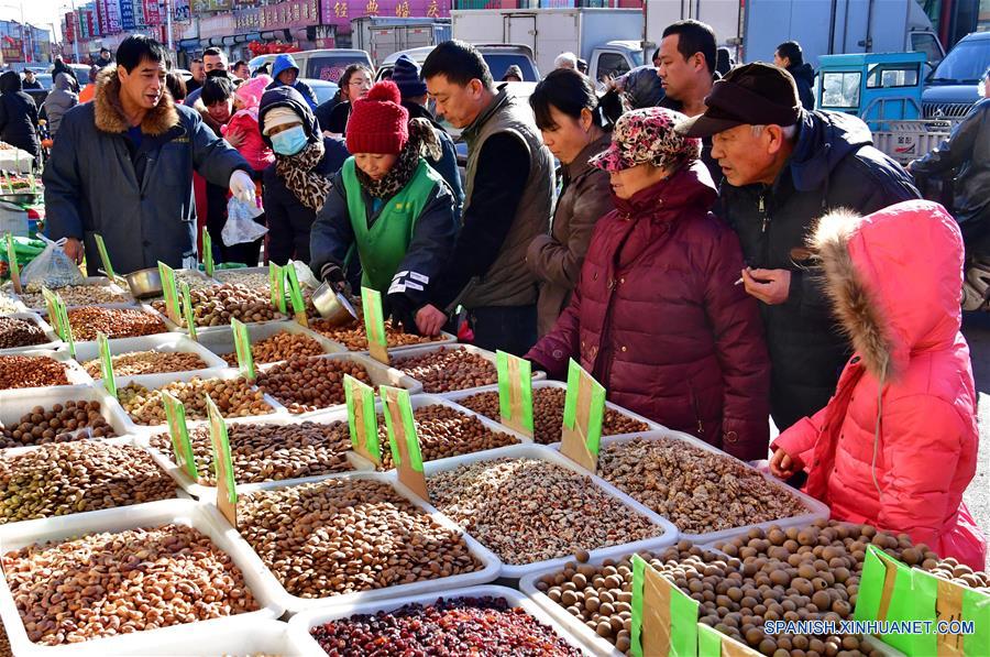 Personas seleccionan cacahuates y semillas en un mercado previo al Festival de Primavera, en la ciudad de Tangshan, en la provincia de Hebei, en el norte de China, el 5 de febrero de 2018. (Xinhua/Yang Shiyao)