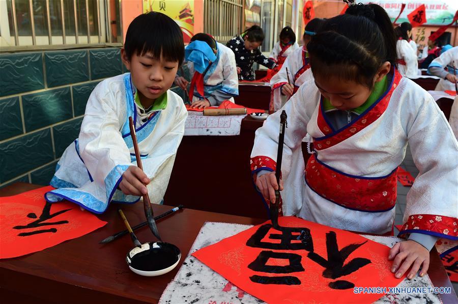 HEBEI, febrero 5, 2018 (Xinhua) -- Estudiantes del grupo de hobby de caligrafía china, escriben coplas para celebrar el próximo Festival de Primavera, en la comunidad de Cangzhou, provincia de Hebei, en el norte de China, el 5 de febrero de 2018. (Xinhua/Fu Xinchun)