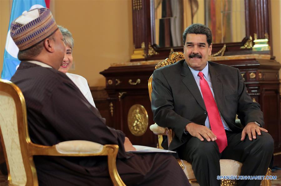 Imagen cedida por la Presidencia de Venezuela, del presidente venezolano, Nicolás Maduro (d), conversando con el secretario general de la Organización de Países Exportadores de Petróleo (OPEP), Mohammed Barkindo (i-frente), durante su reunión en el Palacio de Miraflores, en Caracas, Venezuela, el 5 de febrero de 2018. De acuerdo con información de la prensa local, Maduro destacó durante la reunión que se reforzarán las medidas que se toman en conjunto con la OPEP para continuar con el acuerdo de recorte firmado por los miembros de la organización, toda vez que los precios del mercado petrolero están en una fase de estabilización, además de informar que propondrá a los integrantes de la OPEP el uso de criptomonedas con respaldo en el crudo. (Xinhua/Presidencia de Venezuela)