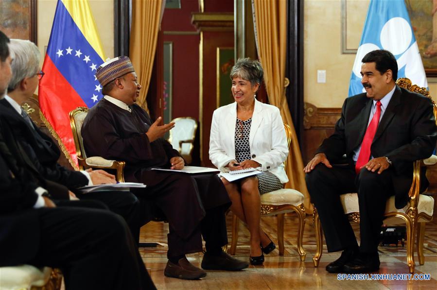 Imagen cedida por la Presidencia de Venezuela, del presidente venezolano, Nicolás Maduro (d), conversando con el secretario general de la Organización de Países Exportadores de Petróleo (OPEP), Mohammed Barkindo (2-i), durante su reunión en el Palacio de Miraflores, en Caracas, Venezuela, el 5 de febrero de 2018. De acuerdo con información de la prensa local, Maduro destacó durante la reunión que se reforzarán las medidas que se toman en conjunto con la OPEP para continuar con el acuerdo de recorte firmado por los miembros de la organización, toda vez que los precios del mercado petrolero están en una fase de estabilización, además de informar que propondrá a los integrantes de la OPEP el uso de criptomonedas con respaldo en el crudo. (Xinhua/Presidencia de Venezuela)