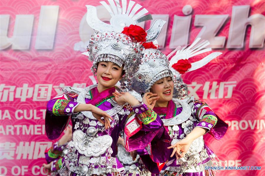 Bailarinas de una compa?ía artística de la provincia de Guizhou de China actúan durante una celebración llevada a cabo por el Festival de Primavera, o A?o Nuevo Lunar chino, en Katmandú, Nepal, el 6 de febrero de 2018. El evento titulado "Guizhou Colorida" fue organizado el martes por el Centro Cultural de China en Nepal. (Xinhua/Pratap Thapa)
