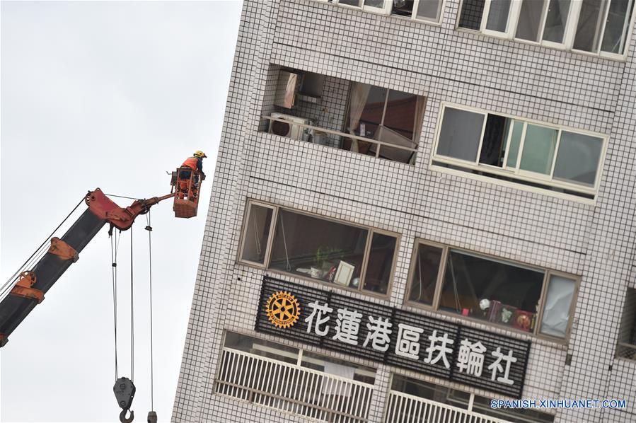 HUALIEN, febrero 7, 2018 (Xinhua) -- Un rescatista revisa un edificio da?ado después del sismo de magnitud 6.5 en el condado Hualien,Taiwan, en el sureste de China, el 7 de febrero de 2018. Al menos dos personas murieron y 219 resultaron heridas tras un terremoto de magnitud 6.5 registrado en la isla de Taiwan, según los datos actualizados a las 7:30 horas. De acuerdo con el Centro de Redes Sismológicas de China, el terremoto sacudió las aguas cercanas al distrito de Hualien de la isla a las 23:50 de anoche. (Xinhua/Yue Yuewei)