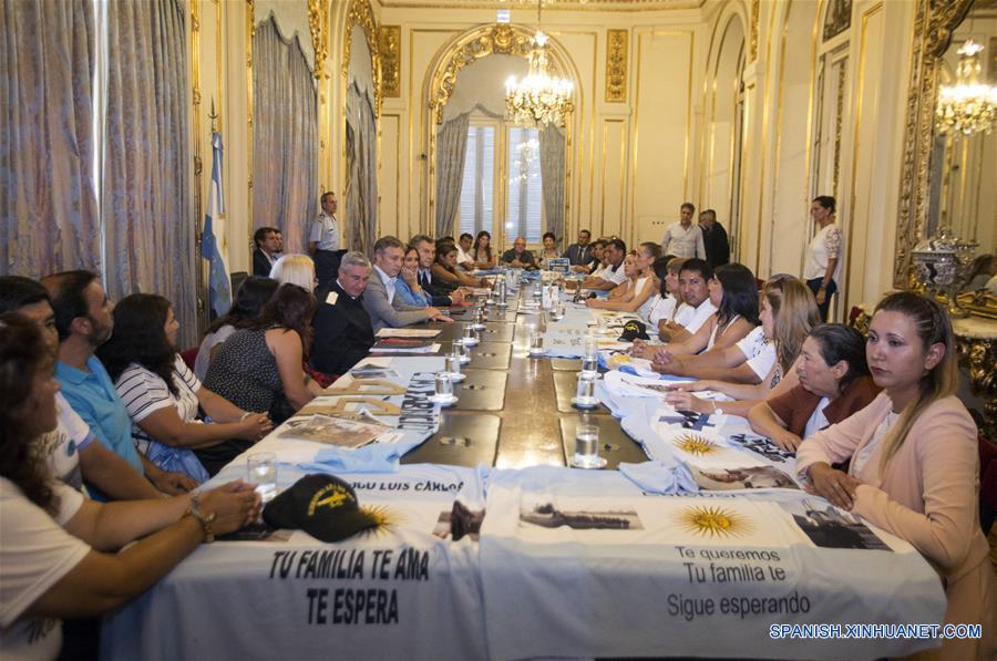 El presidente de Argentina, Mauricio Macri (11-i) participa en una reunión con los familiares de los tripulantes del submarino ARA San Juan, en la Casa Rosada, en Buenos Aires, Argentina, el 6 de febrero de 2018. El submarino ARA San Juan desapareció el 15 de noviembre de 2017 en el Atlántico Sur, con 44 tripulantes a bordo. (Xinhua/Martín Zabala)