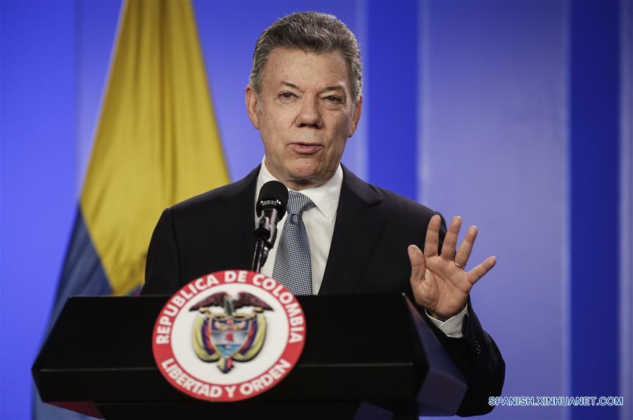 BOGOTA, febrero 6, 2018 (Xinhua) -- El presidente colombiano, Juan Manuel Santos, participa durante una declaración ante representantes de medios de comunicación conjunta con el secretario de Estado de Estados Unidos, Rex Tillerson, en la Casa de Nari?o, en Bogotá, capital de Colombia, el 6 de febrero de 2018. El secretario de Estado de Estados Unidos, Rex Tillerson, llegó el martes al aeropuerto del Comando Aéreo de Transporte Militar en Bogotá, donde fue recibido por la viceministra colombiana de Relaciones Exteriores, Patti Londo?o. Tillerson y Santos abordaron durante su reunión temas como el apoyo que entrega Estados Unidos al posconflicto, la lucha contra las drogas y la delincuencia transnacional organizada. (Xinhua/Jhon Paz)