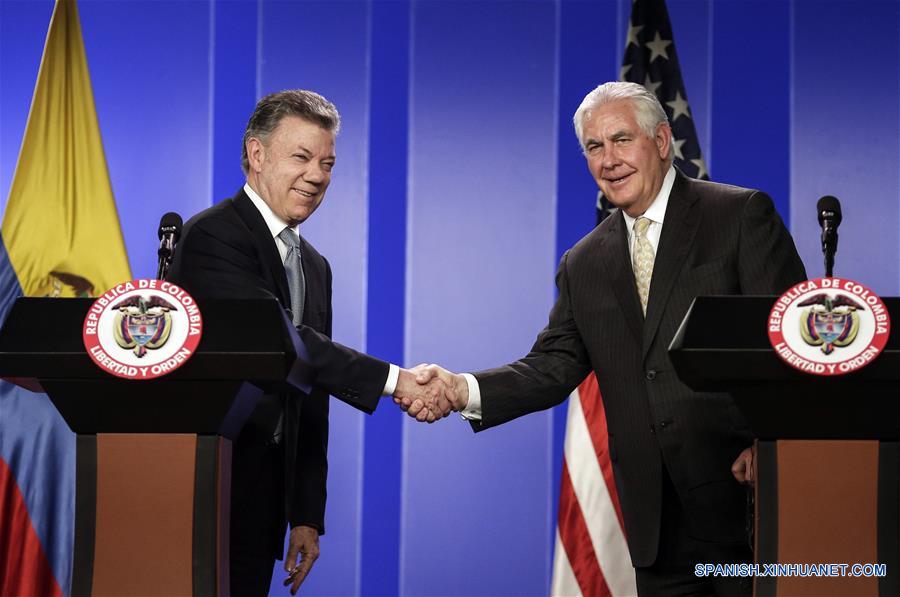 BOGOTA, febrero 6, 2018 (Xinhua) -- El presidente colombiano, Juan Manuel Santos (i), estrecha la mano con el secretario de Estado de Estados Unidos, Rex Tillerson (d), durante una declaración ante representantes de medios de comunicación, en la Casa de Nari?o, en Bogotá, capital de Colombia, el 6 de febrero de 2018. El secretario de Estado de Estados Unidos, Rex Tillerson, llegó el martes al aeropuerto del Comando Aéreo de Transporte Militar en Bogotá, donde fue recibido por la viceministra colombiana de Relaciones Exteriores, Patti Londo?o. Tillerson y Santos abordaron durante su reunión temas como el apoyo que entrega Estados Unidos al posconflicto, la lucha contra las drogas y la delincuencia transnacional organizada. (Xinhua/Jhon Paz)