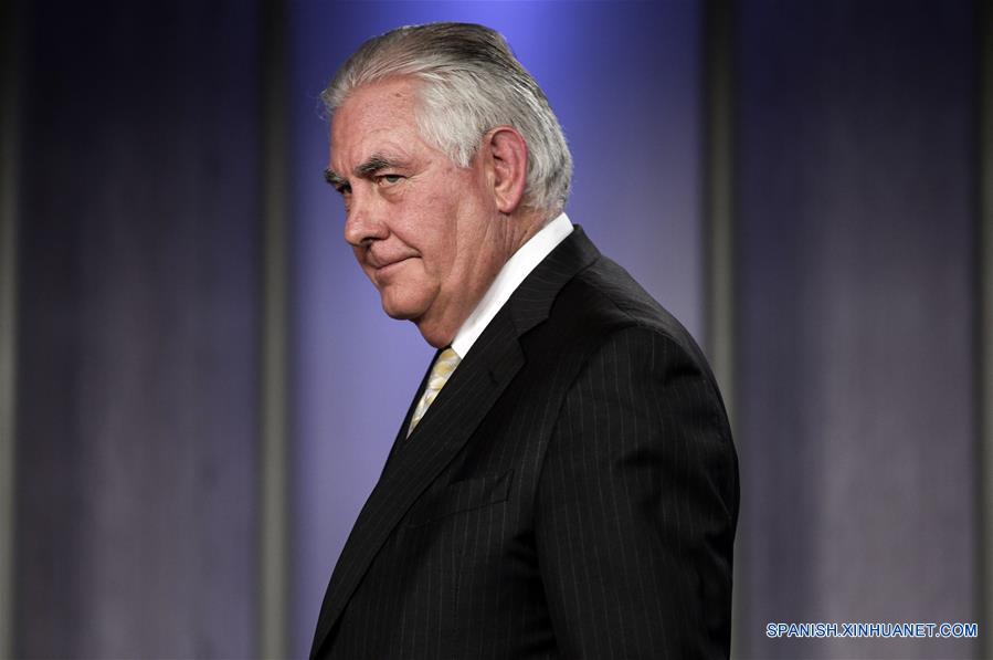 BOGOTA, febrero 6, 2018 (Xinhua) -- El secretario de Estado de Estados Unidos, Rex Tillerson, participa durante una declaración ante representantes de medios de comunicación conjunta con el presidente de Colombia, Juan Manuel Santos, en la Casa de Nari?o, en Bogotá, capital de Colombia, el 6 de febrero de 2018. El secretario de Estado de Estados Unidos, Rex Tillerson, llegó el martes al aeropuerto del Comando Aéreo de Transporte Militar en Bogotá, donde fue recibido por la viceministra colombiana de Relaciones Exteriores, Patti Londo?o. Tillerson y Santos abordaron durante su reunión temas como el apoyo que entrega Estados Unidos al posconflicto, la lucha contra las drogas y la delincuencia transnacional organizada. (Xinhua/Jhon Paz)