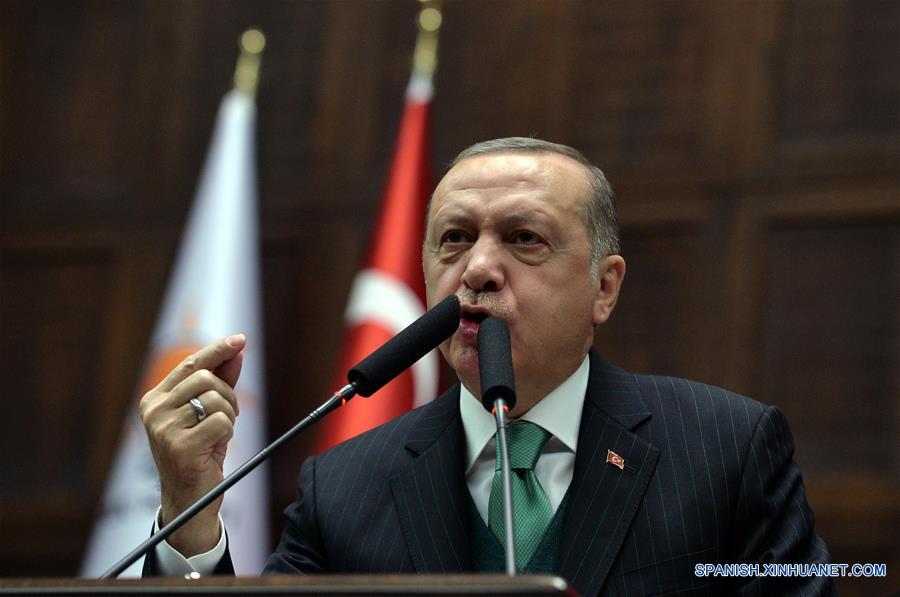 El presidente de Turquía, Recep Tayyip Erdogan, pronuncia un discurso durante la reunión del grupo parlamentario del gobernante Partido Justicia y Desarrollo, en Ankara, Turquía, el 6 de febrero de 2018. A pesar de las advertencias de Estados Unidos, el presidente de Turquía, Recep Tayyip Erdogan, prometió que las tropas turcas expandirán las operaciones militares transfronterizas de Afrin a Manbij, en Siria. (Xinhua/Mustafa Kaya)