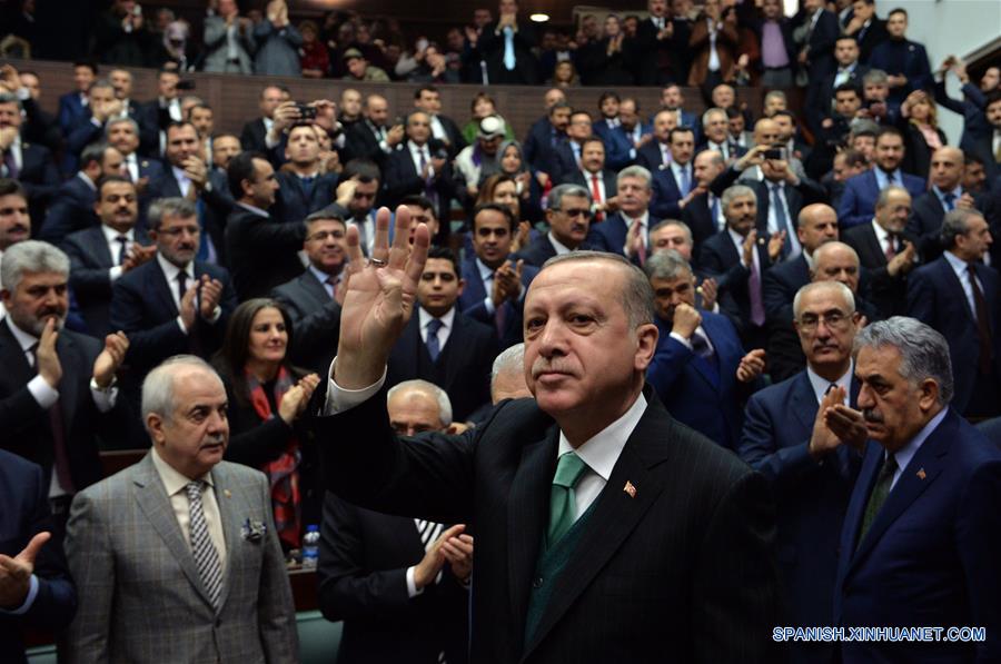El presidente de Turquía, Recep Tayyip Erdogan (frente), asiste a la reunión del grupo parlamentario del gobernante Partido Justicia y Desarrollo, en Ankara, Turquía, el 6 de febrero de 2018. A pesar de las advertencias de Estados Unidos, el presidente de Turquía, Recep Tayyip Erdogan, prometió que las tropas turcas expandirán las operaciones militares transfronterizas de Afrin a Manbij, en Siria. (Xinhua/Mustafa Kaya)