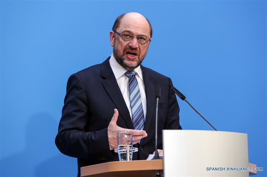 BERLIN, febrero 7, 2018 (Xinhua) -- El líder de la Unión Socialcristiana (CSU) alemana, Martin Schulz, participan durante una conferencia de prensa conjunta en la sede de la Unión Cristianodemócrata (CDU), en Berlín, Alemania, el 7 de febrero de 2018. Los tres partidos alemanes alcanzaron un acuerdo sobre una "gran coalición" luego de difíciles negociaciones, informó la prensa local la ma?ana del miércoles. (Xinhua/Shan Yuqi)