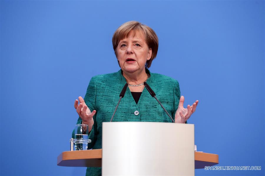 BERLIN, febrero 7, 2018 (Xinhua) -- La canciller de Alemania y líder de la Unión Cristianodemócrata (CDU) alemana, Angela Merkel, participa durante una conferencia de prensa conjunta en la sede de la CDU, en Berlín, Alemania, el 7 de febrero de 2018. Los tres partidos alemanes alcanzaron un acuerdo sobre una "gran coalición" luego de difíciles negociaciones, informó la prensa local la ma?ana del miércoles. (Xinhua/Shan Yuqi)