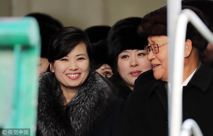 Los miembros de la compa?ía artística Samjiyon de la República Popular Democrática de Corea desembarcan del Mangyongbong-92 en Donghae, provincia de Gangwon, el 7 de febrero del 2018 para un ensayo en el Centro de Artes de Gangneung. [Foto: VCG]