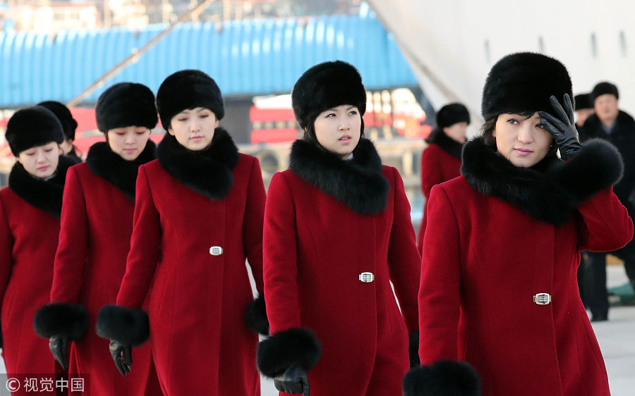 Mukho,08/02/2018(El Pueblo en Línea)-Los miembros de la compa?ía artística Samjiyon de la República Popular Democrática de Corea desembarcan del Mangyongbong-92 en Donghae, provincia de Gangwon, el 7 de febrero del 2018 para un ensayo en el Centro de Artes de Gangneung. Los 140 miembros de Samjiyon ofrecerán presentaciones en Gangneung, ciudad cercana a Pyeongchang, sede de los XXIII Juegos Olímpicos de Invierno, y en Seúl, capital de Corea del Sur. [Foto: VCG]
