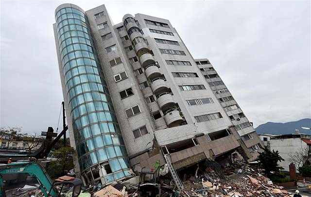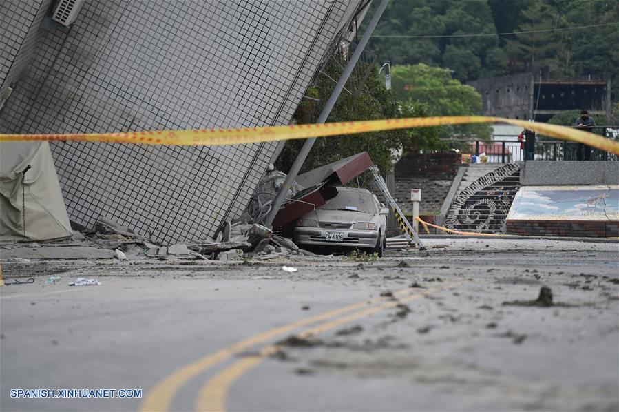HUALIEN, febrero 7, 2018 (Xinhua) -- Vista de un edificio inclinado después del sismo de magnitud 6.5 en el condado Hualien, Taiwan, en el sureste de China, el 7 de febrero de 2018. (Xinhua/Yue Yuewei)