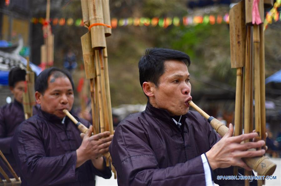 Personas del grupo étnico dong tocan el lusheng, un instrumento de viento de tubo de ca?a, durante una celebración para recibir el Festival de Primavera en la aldea de Cenle del condado de Rongjiang, en la provincia de Guizhou, en el suroeste de China, el 7 de febrero de 2018. (Xinhua/Wang Bingzhen)