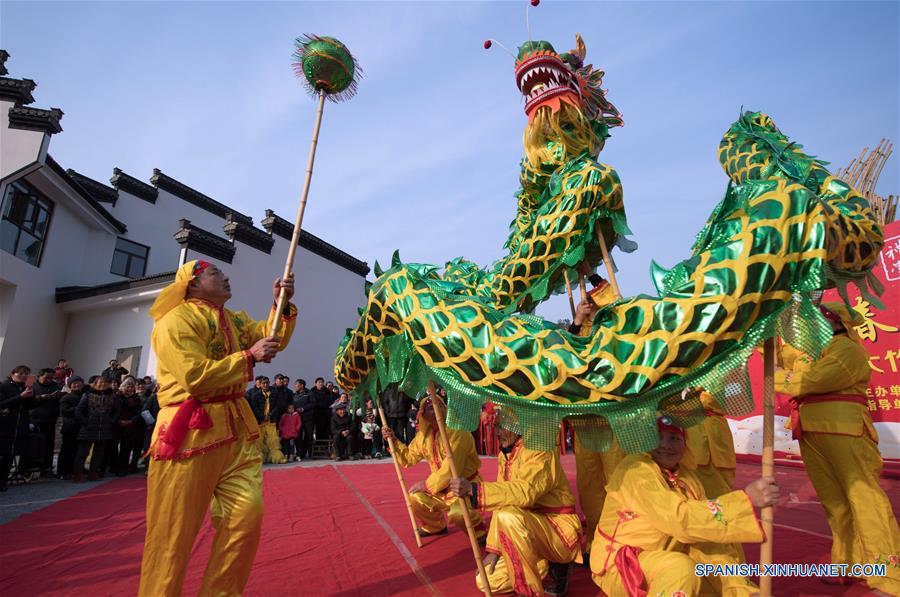 ZHEJIANG, febrero 8, 2018 (Xinhua) -- Actores interpretan la danza del dragón en el día de Xiaonian, en la villa de Dazhu del municipio de Xiaofeng del condado de Anji, provincia de Zhejiang, en el este de China, el 8 de febrero de 2018. Xiaonian, el día 23 o 24 del mes 12 del calendario lunar chino, marca el comienzo de la cuenta regresiva del Festival de Primavera. Un total de 36 espectáculos culturales serán puestos en escena en el condado. (Xinhua/Weng Xinyang)