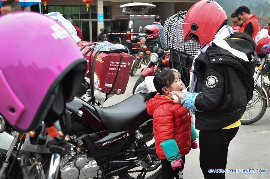 GUANGDONG, febrero 8, 2018 (Xinhua) -- Imagen del 7 de febrero de 2018 de una madre alimentando a su hija en la estación de servicio de Xiaoxiang en Zhaoqing, provincia de Guangdong, en el sur de China. Muchos trabajadores migrantes de China eligen ir a casa en motocicleta para las reuniones familiares en el Festival de Primavera, o A?o Nuevo Lunar tradicional chino. (Xinhua/Liang Xu)