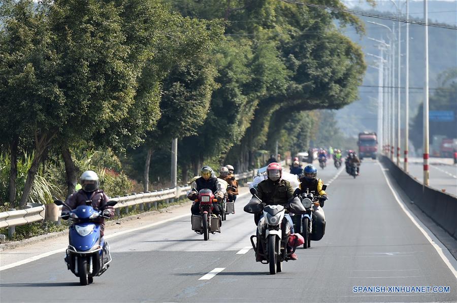 GUANGDONG, febrero 8, 2018 (Xinhua) -- Trabajadores migrantes transitan a través de la autopista nacional No. 321, en la provincia de Guangdong, en el sur de China, el 8 de febrero de 2018. Muchos trabajadores migrantes de China eligen ir a casa en motocicleta para las reuniones familiares en el Festival de Primavera, o A?o Nuevo Lunar tradicional chino. (Xinhua/Liang Xu)
