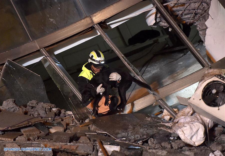 HUALIEN, febrero 9, 2018 (Xinhua) -- Un rescatista trabaja en el edificio Yun Men Tusi Ti da?ado, en el condado de Hualien, Taiwan, en el sureste de China, el 9 de febrero de 2018. (Xinhua/Yue Yuewei)