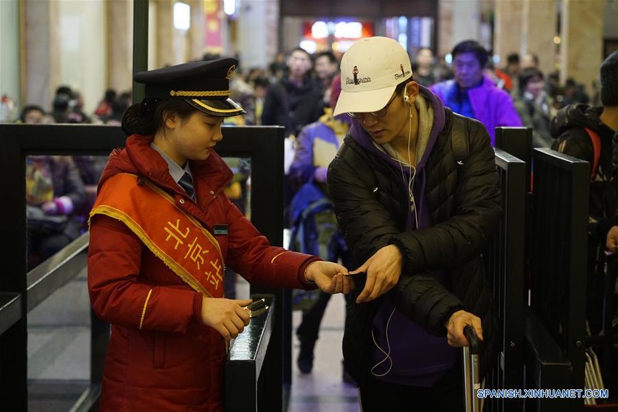 BEIJING, febrero 10, 2018 (Xinhua) -- Imagen del 9 de febrero de 2018 de un pasajero siendo registrado para abordar, en la Estación de Ferrocarril de Beijing, en Beijing, capital de China. El ferrocarril chino recibe un frenesí de viajes mientras el Festival de Primavera se acerca. La temporada alta de viajes del Festival de Primavera 2018, conocida como el Chunyun, comenzó el 1 de febrero y durará hasta el 12 de marzo. Se espera que aprximadamente 2.98 mil millones de viajes sean realizados durante el Chunyun. El Festival de Primavera, o A?o Nuevo Lunar chino se celebra el 16 de febrero este a?o. (Xinhua/Xing Guangli)