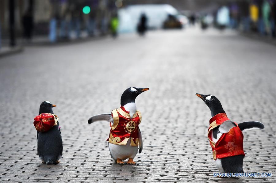 HEILONGJIANG, febrero 10, 2018 (Xinhua) -- Pingüinos del parque zoológico Harbin Polarland portando trajes tang caminan sobre la Calle Central de Harbin, provincia de Heilongjiang, en el noreste de China, el 10 de febrero de 2018. (Xinhua/Wang Jianwei)