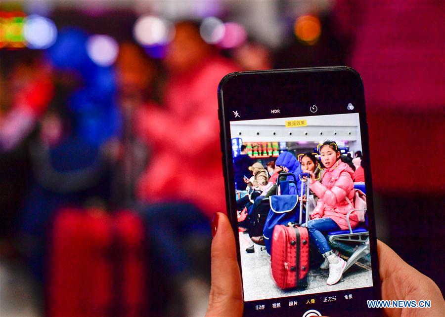Zhang Yuliang toma fotos de los pasajeros que están en la sala de espera de la estación de trenes del norte en Chongqing, el 9 de febrero del 2018. Zhang Yuliang es una joven de 25 a?os que le encanta dejar constancia de la vida cotidiana. Gracias a su teléfono inteligente, durante la temporada alta de viajes con motivo del Festival de la Primavera, ella tomó fotos desde la estación de trenes del norte de Chongqing hasta la estación de tren del sur en Dazu, (Foto: Liu Chan)