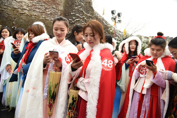 Las jóvenes utilizan la opción "Shake It" de WeChat para relacionarse con chicos que se encuentran cerca, Hangzhou, provincia de Zhejiang, 18 de enero. [Foto: Lian Guoqing]