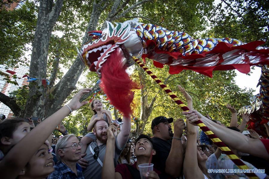 BUENOS AIRES, febrero 11, 2018 (Xinhua) -- Imagen del 10 de febrero de 2018, de personas reaccionando durante la "Danza del Dragón", en el marco de la celebración del A?o Nuevo Lunar chino, en la Plaza Parques Nacionales, en Buenos Aires, Argentina. Miles de ciudadanos argentinos y chinos residentes en la ciudad de Buenos Aires se agolparon el sábado en la Plaza Parques Nacionales, para celebrar la Fiesta de la Primavera y disfrutar de un espectáculo cargado de danza tradicional, música y acrobacias que da la bienvenida al A?o Nuevo chino del Perro 2018. En el comienzo de la celebración, el embajador de China en Argentina, Yang Wanming, protagonizó el ritual "Clavado de Pupilas", en el que con pinceles sumergidos en tinta roja se dibujaron los ojos a cuatro dragones, propios de la cultura milenaria china, para despertar su energía e iniciar el festival. (Xinhua/Martín Zabala)