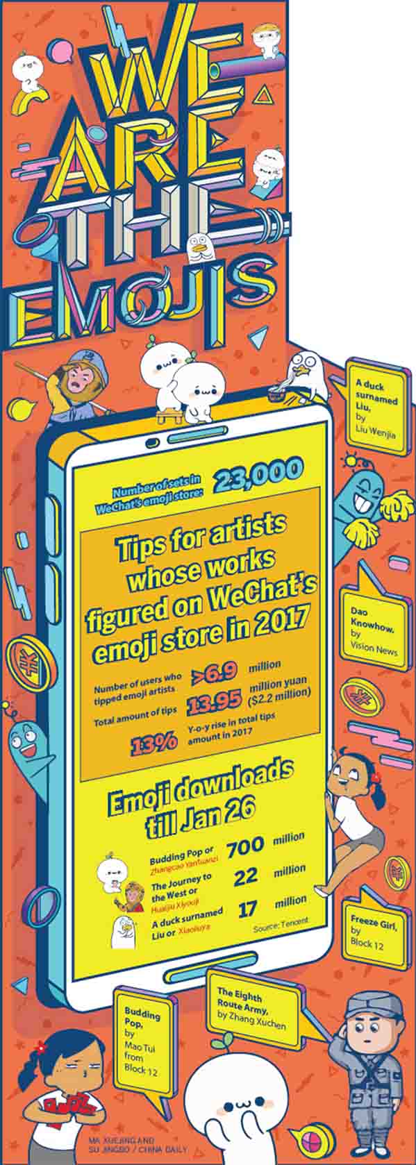 El conjunto más popular de emojis entre las creaciones de Zhang -se llama Huaijiu Xiyouji, inspirado en la novela china Peregrinación al Oeste, una historia sobre cuatro personajes que hacen una peregrinación en busca de las escrituras budistas- ha sido descargado más de 22 millones veces e intercambiado más de 400 millones de veces en mensajes electrónicos.
