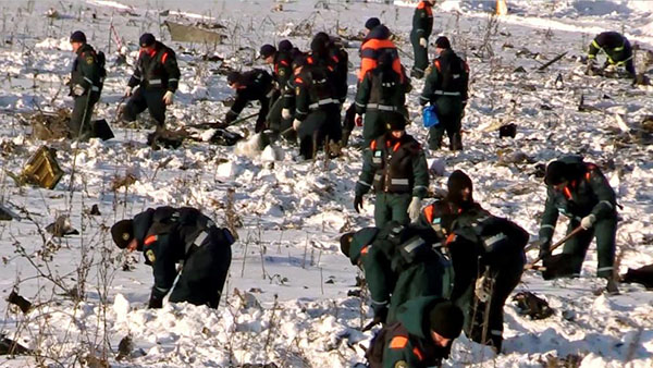 Captura de vídeo de los trabajos de búsqueda de restos humanos y retirada de trozos del fuselaje del avión en el lugar del accidente del avión de pasajeros AN-148 de la aerolínea rusa Saratov Airlines cerca de la localidad de Stepanovskoy (Ministerio De Emergencias Ruso / EFE)