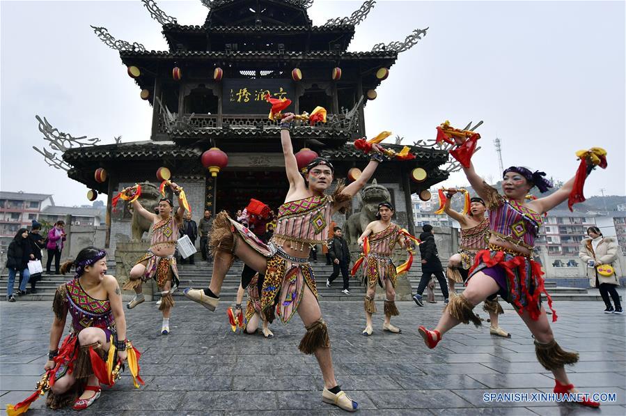 HUBEI, febrero 12, 2018 (Xinhua) -- Integrantes de un grupo de arte folclórico presentan un espectáculo llevado a cabo en el condado de Xuan'en de la Prefectura Autónoma Tujia y Miao de Enshi, provincia de Hubei, en el centro de China, el 12 de febrero de 2018. De acuerdo con información de la prensa local, el grupo de arte folclórico está integrado por 159 artistas amateur, quienes viajan cada a?o por ciudades y municipios presentándose sin ningún costo para la gente local. (Xinhua/Song Wen)