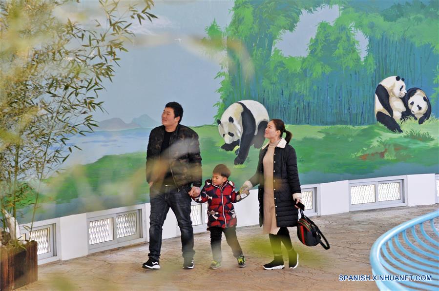 Turistas visitan al panda gigante Xi Le en el Zoológico Tianjin, en Tianjin, en el norte de China, el 12 de febrero de 2018. El recinto de pandas gigantes fue abierto al público el lunes después de una renovación de cuatro meses. (Xinhua/Shi Songyu)