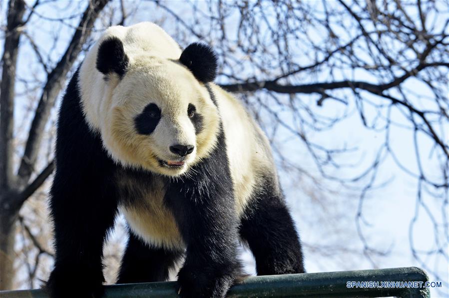 El panda gigante Xi Le permanece en el Zoológico Tianjin, en Tianjin, en el norte de China, el 12 de febrero de 2018. El recinto de pandas gigantes fue abierto al público el lunes después de una renovación de cuatro meses. (Xinhua/Shi Songyu)