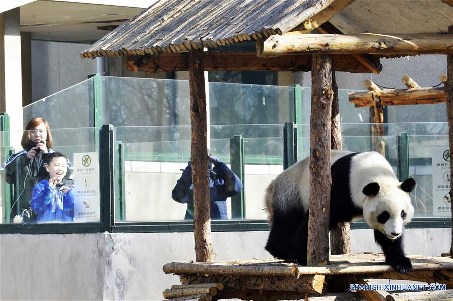 Turistas visitan al panda gigante Xi Le en el Zoológico Tianjin, en Tianjin, en el norte de China, el 12 de febrero de 2018. El recinto de pandas gigantes fue abierto al público el lunes después de una renovación de cuatro meses. (Xinhua/Shi Songyu)