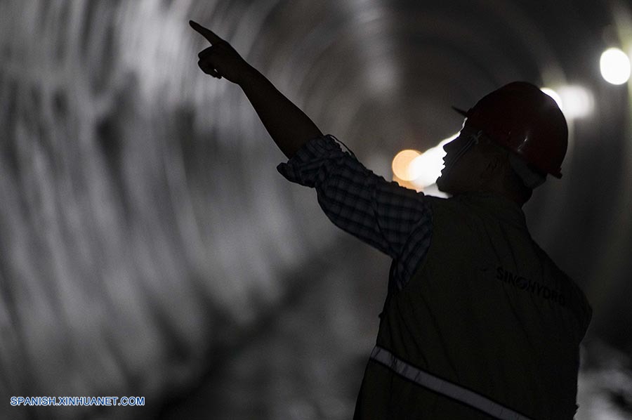 Imagen del 14 de abril de 2017 de un ingeniero civil chino supervisando los trabajos en un túnel en la zona de casa de máquinas del proyecto hidroeléctrico Minas San Francisco, en Sarayunga, en la provincia del Azuay, Ecuador.(Xinhua/Santiago Armas)