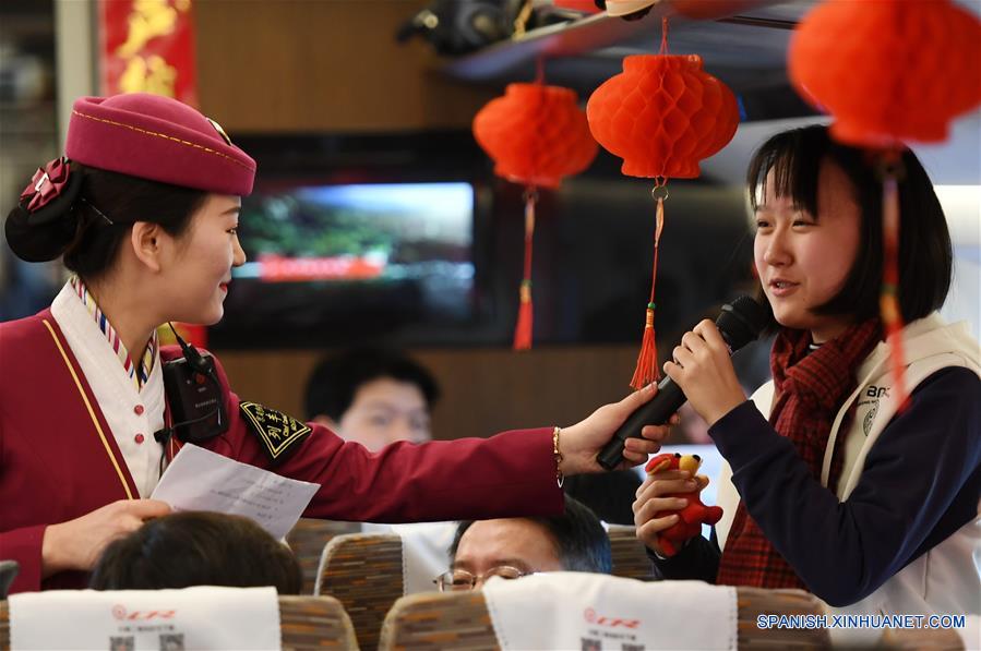 Una pasajera responde una pregunta durante una celebración llevada a cabo a bordo del tren de alta velocidad G13 que va de la capital Beijing a Shanghai, en el este de China, el 13 de febrero de 2018. Un equipo artístico ferroviario proporcionó un espectáculo gratuito a los pasajeros a bordo del tren G13 como una celebración del próximo Festival de Primavera. (Xinhua/Zhan Chenlin)