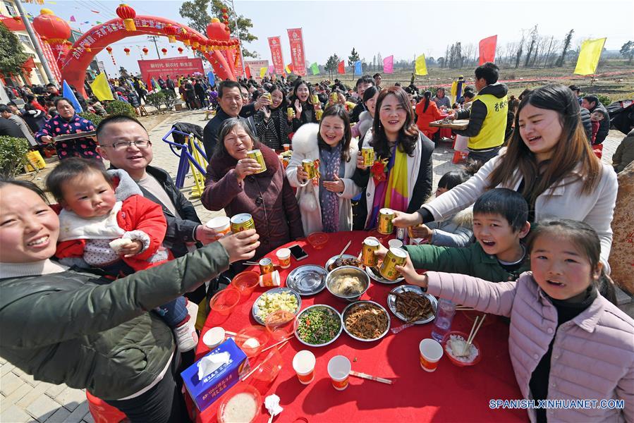 Residentes se reúnen en una fiesta llevada a cabo para celebrar el próximo Festival de Primavera, en la villa de Xinlouqian del condado de Fengxin, provincia de Jiangxi, en el este de China, el 13 de febrero de 2018. (Xinhua/Wan Xiang)