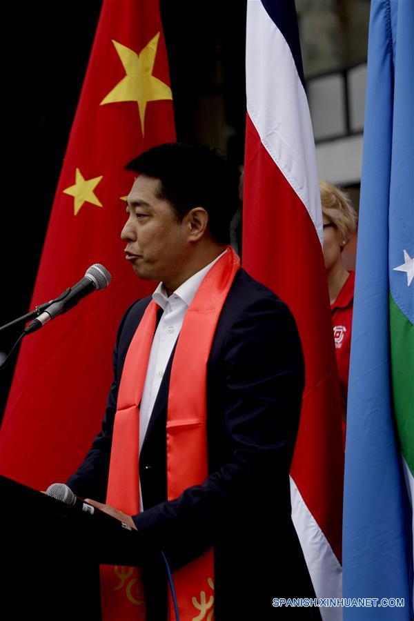 Imagen del 17 de febrero de 2018, del embajador de China en Costa Rica, Tang Heng, pronunciando un discurso durante la ceremonia para celebrar el A?o Nuevo chino, en el Barrio Chino de San José, Costa Rica. La comunidad china de Costa Rica celebró el sábado en San José el segundo día de la Fiesta de Primavera o A?o Nuevo Lunar chino, con un gran evento en el Barrio Chino de la capital costarricense. Música de ambos países, exhibición de artes marciales, venta de comidas chinas tradicionales, muestra de productos chinos y un ambiente festivo, fueron parte de esta celebración de la colonia china en Costa Rica. (Xinhua/Kent Gilbert)