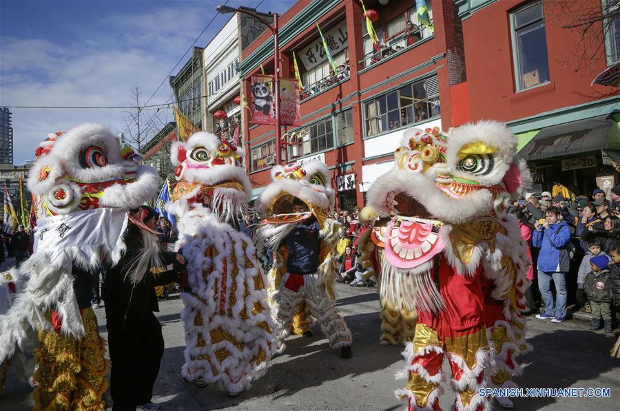 Participantes realizan una danza del león durante el 45 Desfile de A?o Nuevo chino en Vancouver, Canadá, el 18 de febrero de 2018. Participantes desfilaron el domingo en las calles del barrio chino de Vancouver para festejar el A?o del Perro, atrayendo a más de 100,000 espectadores. (Xinhua/Liang Sen)