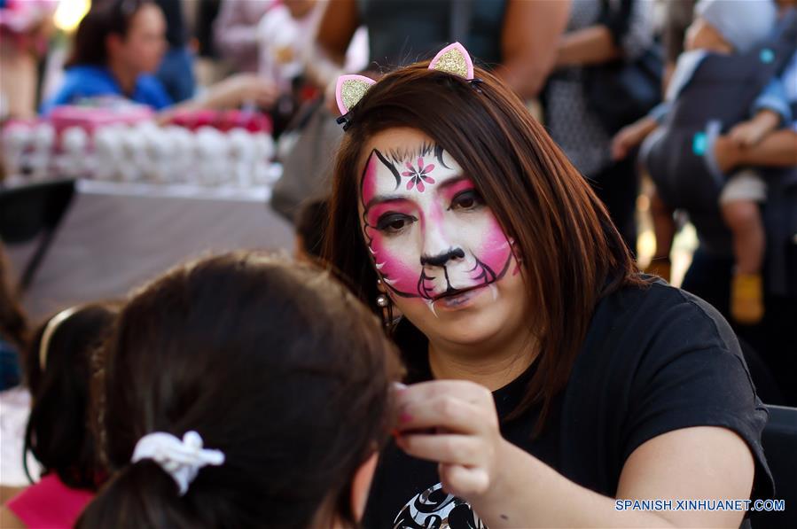 Una mujer maquilla a una ni?a durante el Gato Fest 2018, con motivo de la celebración del Día Internacional del Gato, en la Ciudad de México, capital de México, el 18 de febrero de 2018. De acuerdo con información de la prensa local, el objetivo del evento es promover la concientización sobre la salud y protección animal, principalmente de los felinos. (Xinhua/Francisco Ca?edo)