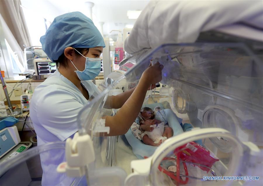 SHANGHAI, febrero 16, 2018 (Xinhua) -- Imagen del 15 de febrero de 2018 de una enfermera cuidando de un bebé prematuro en la Unidad de Cuiadados Intensivos Neonatal (NICU, por sus siglas en inglés) del Hospital Infantil de la Universidad Fudan, en Shanghai, en el este de China. Los trabajadores médicos del hospital permanecieron en sus puestos de trabajo en la víspera del A?o Nuevo Lunar chino para cuidar de los pacientes. (Xinhua/Liu Ying)