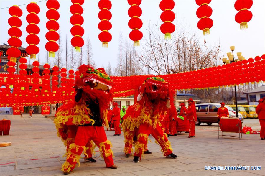 SHANDONG, febrero 16, 2018 (Xinhua) -- Artistas realizan una presentación en el punto escénico de la Monta?a Yimeng de Linyi, provincia de Shandong, en el este de China, el 16 de febrero de 2018. Las personas realizaron diferentes actividades para celebrar el A?o Nuevo Lunar chino en toda China. (Xinhua/Wu Jiquan)